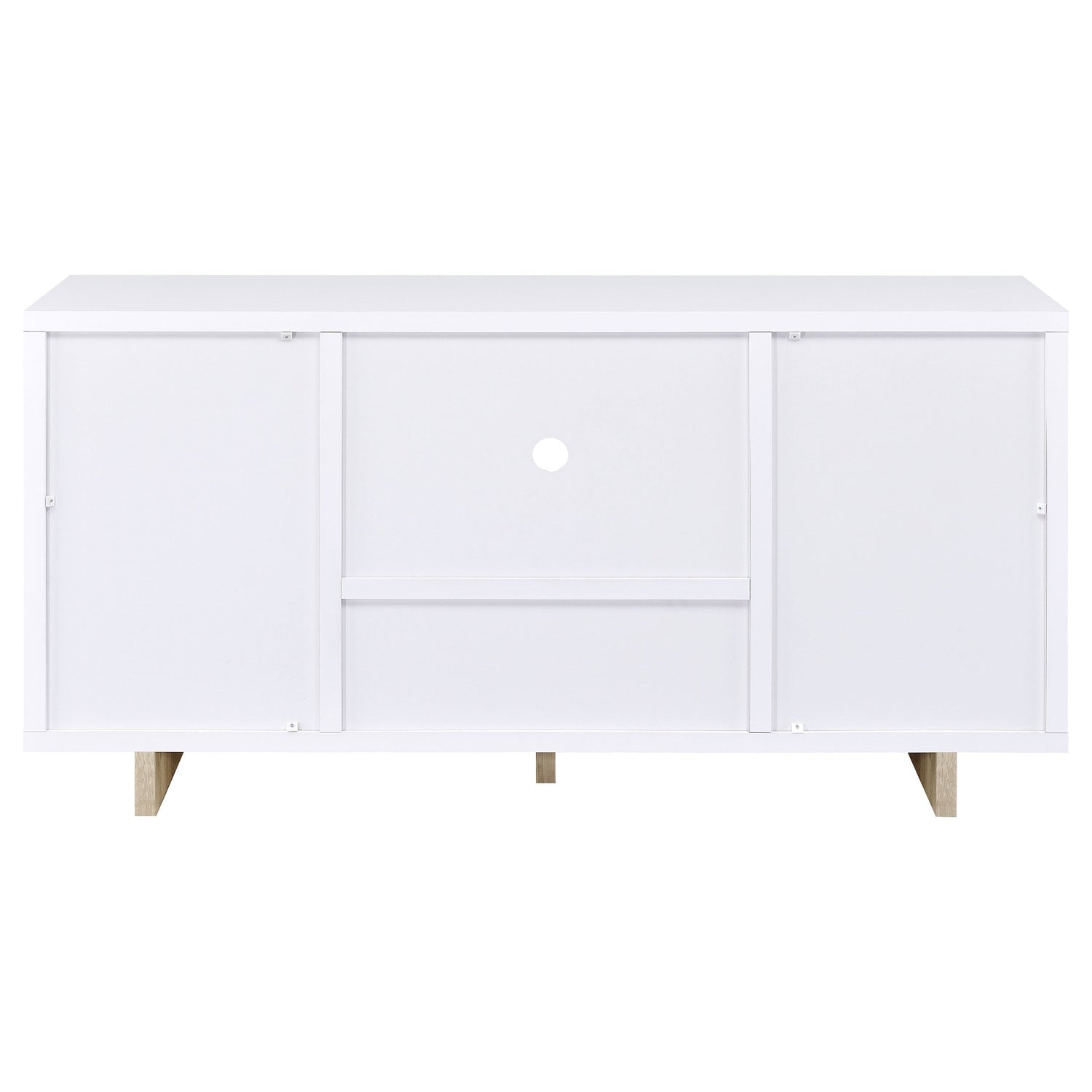 Embrace versatility and casual style with a modern farmhouse credenza. Packed with functional storage options, it embodies relaxed style with a two tone finish that features a white frame and wood grain doors and drawer front. Its melamine finish is durable and perfect for workspaces and entertaining spaces. The credenza features an open shelf with a cord management opening and an arched detail that adds character. It easily hosts a printer in your home office or a gaming console in your bedroom.