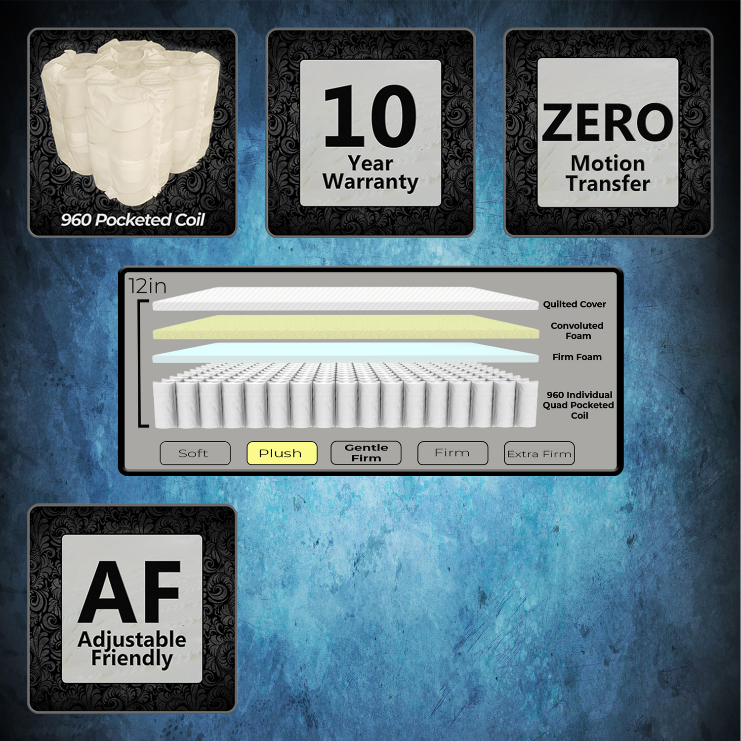 This beautiful 12 in, plush mattress is sure to please any side, back or stomach sleeper. The Hybrid Essence is fitted with a 960 pocketed coil unit specially designed for outstanding softness, low motion transfer and is adjustable friendly. This is a quality mattress for a quality price.