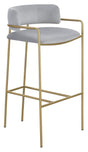 A soft and supple grey velvet envelops the comfy padded seat and linear backrest of this chic and glamorous stool. Situated and supported by a slim rod-like frame in a gold finish, this stool offers an air of sophistication to any bar top or kitchen island. The cool grey upholstery and warm metallic finish contrast, leaving a striking visual to any space. With a retro flair and glam vibe, this elegant stool is perfectly suited for a mid-century style home or contemporary entertainment room. Slide up this stool and relax with a cocktail or glass of wine.