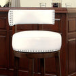 SHIRLEY Dark Oak/White 29" Bar Stool, 23 1/4"W X 23 1/4"D X 40 1/2"H, 53.9lbs. Impress your guests with this gorgeous contemporary bar chair. A simplified design decorated with nailhead trim for a pop of modern styles, the padded seats and backrests offer optimal comfort to become the perfect piece for entertaining guests. Enjo y long conversations over glasses of wine while indulging in one another's company. Features: Contemporary Style 30" Swivel Bar Stool Nailhead Trim Padded Leatherette Seat Solid Wood, Others Dark Oak Finish White