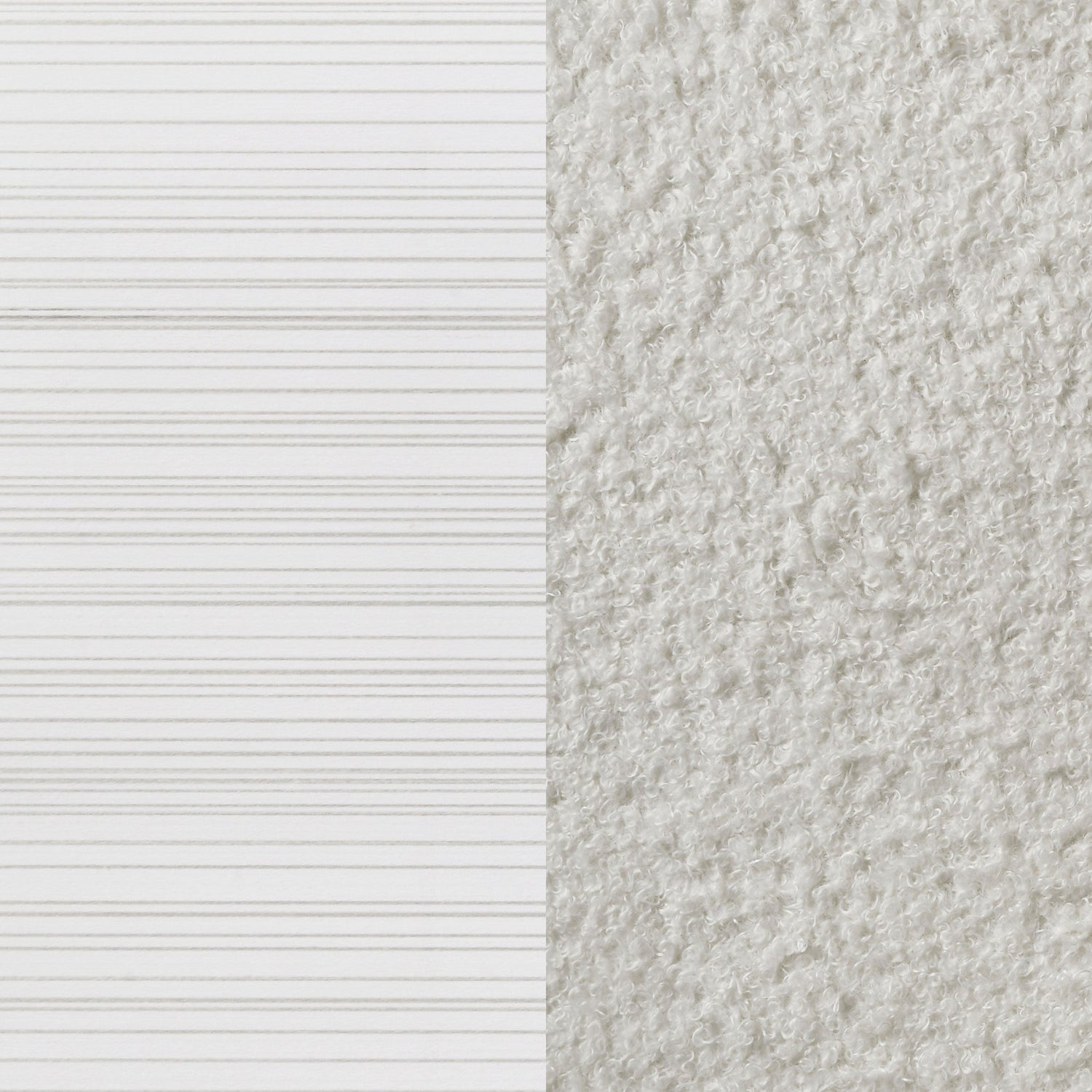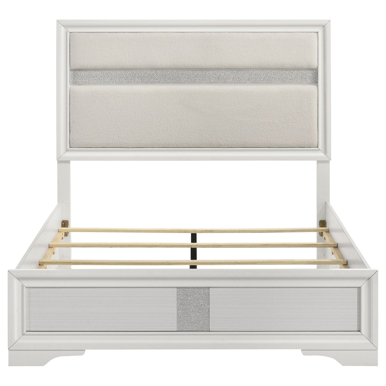 Introduce a little bit of glam flair to your bedroom with a modern upholstered bed. Featuring padded white fabric panels, the headboard is complete with molded trim and a horizontal stripe that glitters in the light. A matching vertical stripe on the low footboard is the perfect complement. A white finish is lightly textured on the panel footboard and rails, while trim is smooth and cool. The bed is complete with slats and center legs for added support and requires a foundation.