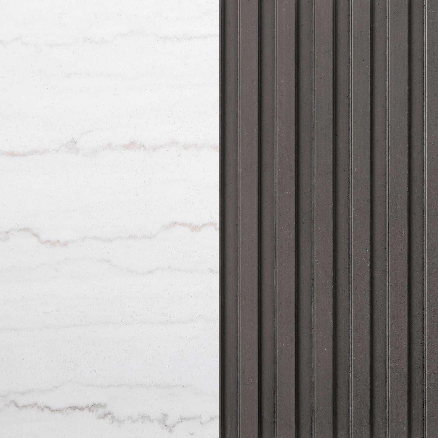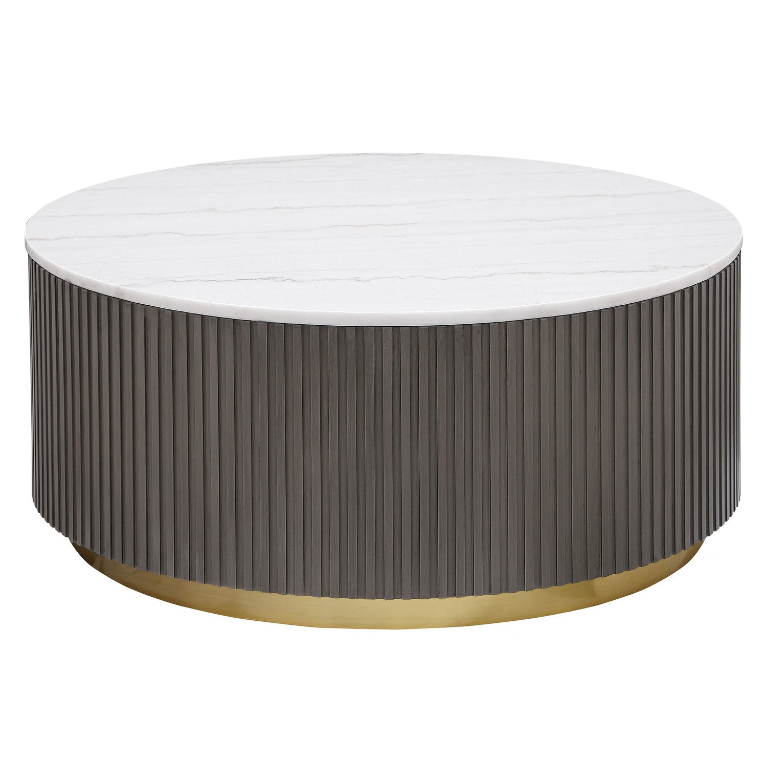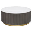 Center your living space with this elegant, modern round coffee table. The genuine white marble top exudes sophistication with its subtle veining, adding organic flair. The clean, light coloration complements any surrounding decor. A ribbed, engineered wood frame in a charcoal finish creates texture and depth, while the brushed gold metal base brings a luxurious touch. This piece seamlessly blends refined materials and design, making it the perfect addition to your living room.