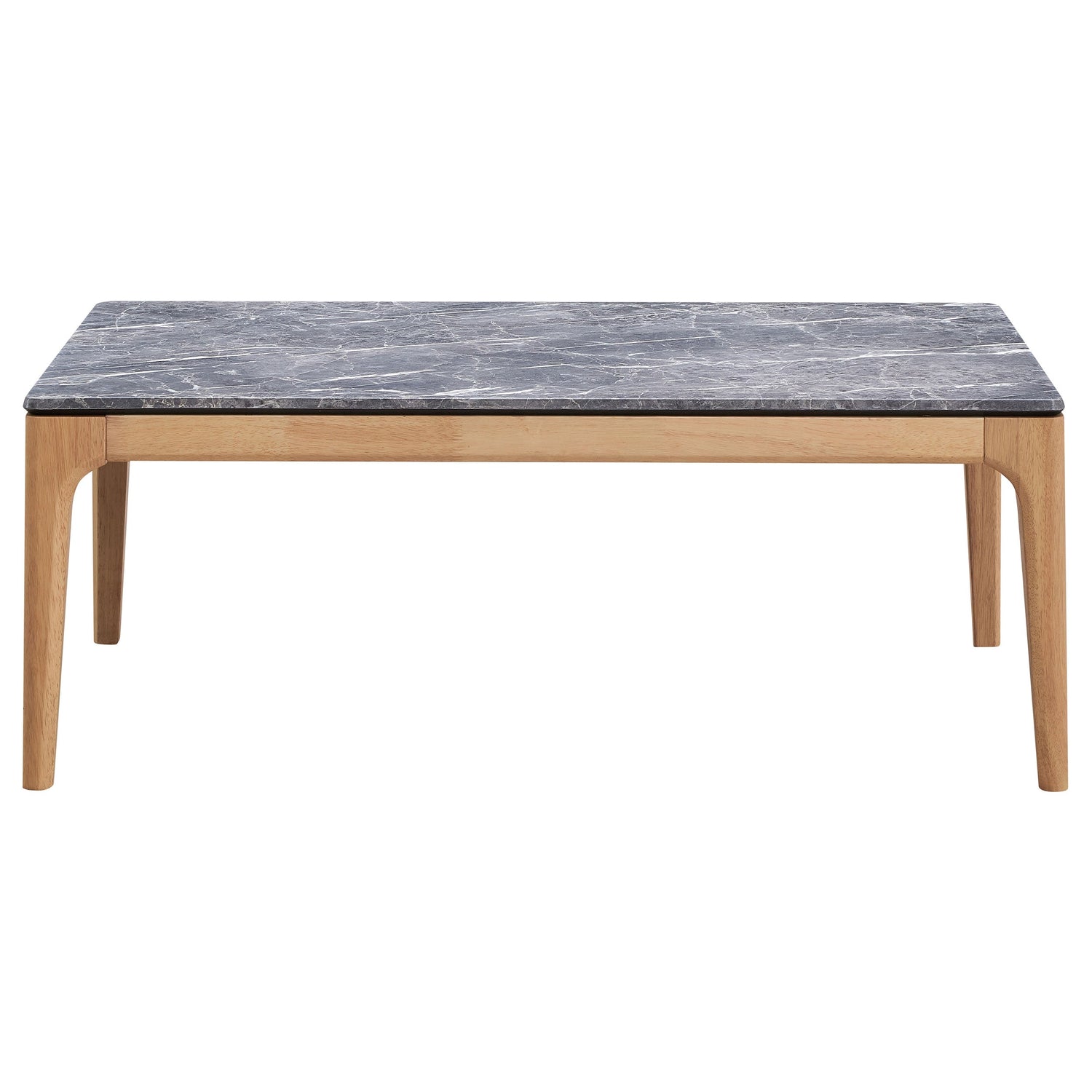 The coffee table stretches out with a confidence born of its mid-century modern heritage, flaunting a rectangular top that offers the luxurious look of marble without the weight. Its high-pressure laminate surface, infused with decorative faux marble laminate, is a visual feast, juxtaposed against the natural brown base that anchors it with a touch of the earthy and real. The sleek lines and cool grey hues are a nod to a design era that celebrated clean aesthetics and functional beauty. It is more than a surface; it's a statement piece, designed to gather around, to showcase, to be lived with and loved.
