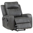 Rich gray and vertical contrasting stitching create a tailored look and feel for a modern power lift recliner. It pairs plush foam cushions with faux leather upholstery, creating a recliner that's both polished and exceptionally inviting. Wide track arms establish it's clean-lined silhouette, while a side pocket adds a place for the remote control or a book. The recliner is power operated with the included remote control, and includes lift functionality that helps one to their feet when needed. It's an ideal solution for multi-generational homes or those with mobility challenges.