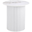 This round end table features a sophisticated sintered stone top with natural veining for a modern and luxurious touch. The sturdy metal base, with its fluted design and white powder-coated finish, delivers both stability and sleek aesthetics. Compact yet impactful, this versatile piece complements a variety of living spaces, offering style and functionality. Designed for everyday use, it seamlessly combines durability with refined design for contemporary interiors.