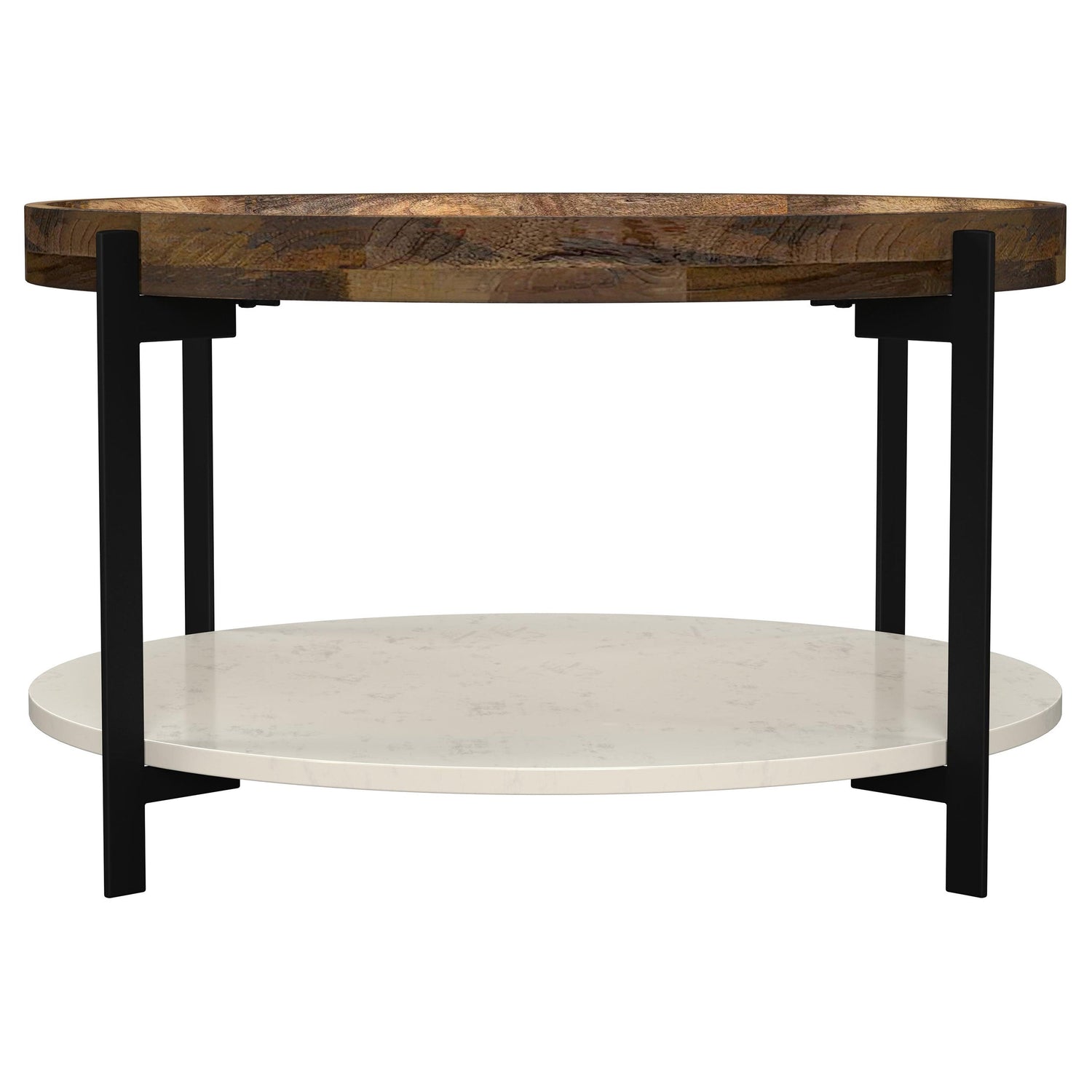 Enhance your living room with this elegant coffee table, a perfect fusion of organic materials and modern design. The stunning round solid mango wood top features unique grain patterns, paired beautifully with a luxurious white marble shelf below. Supported by slender black iron legs, this cocktail table provides sturdy support while maintaining a minimalist, airy aesthetic. The natural charm of the wood and the sleek marble create a sophisticated yet functional centerpiece for any space. This versatile coffee table will seamlessly elevate the style of your home while offering practical storage and display options.