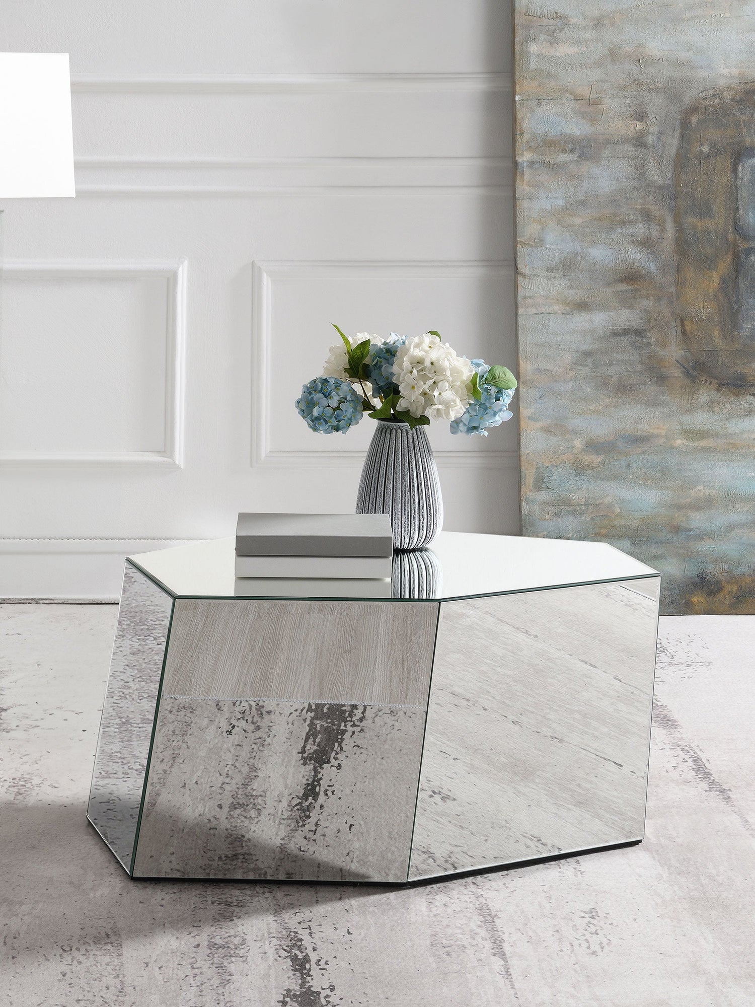 This mirrored coffee table combines a bold hexagonal silhouette with a geometric design, offering glamorous contemporary appeal. Irregular sides create visual depth, while mirrored surfaces add refined sophistication. Fully set up and ready to use, this table is a chic centerpiece for any modern living space.