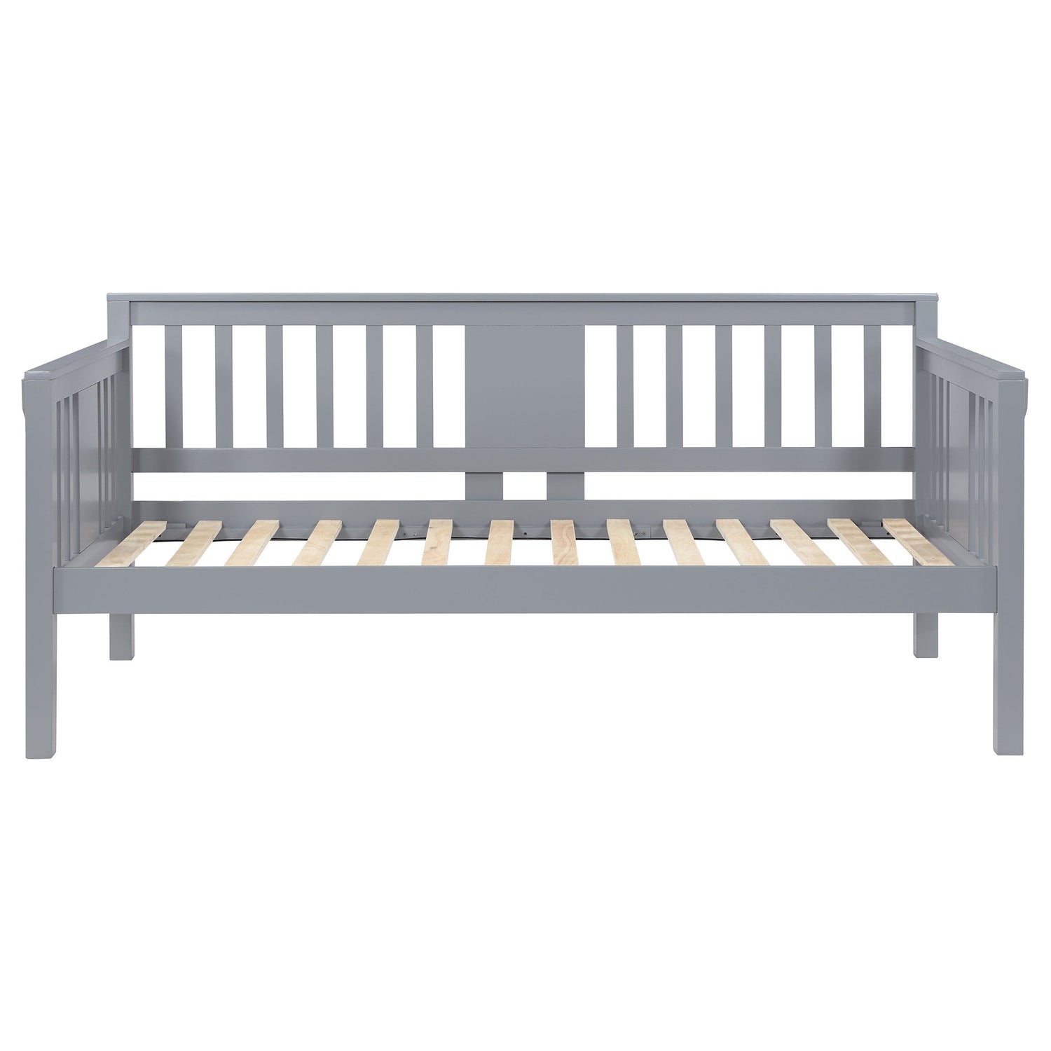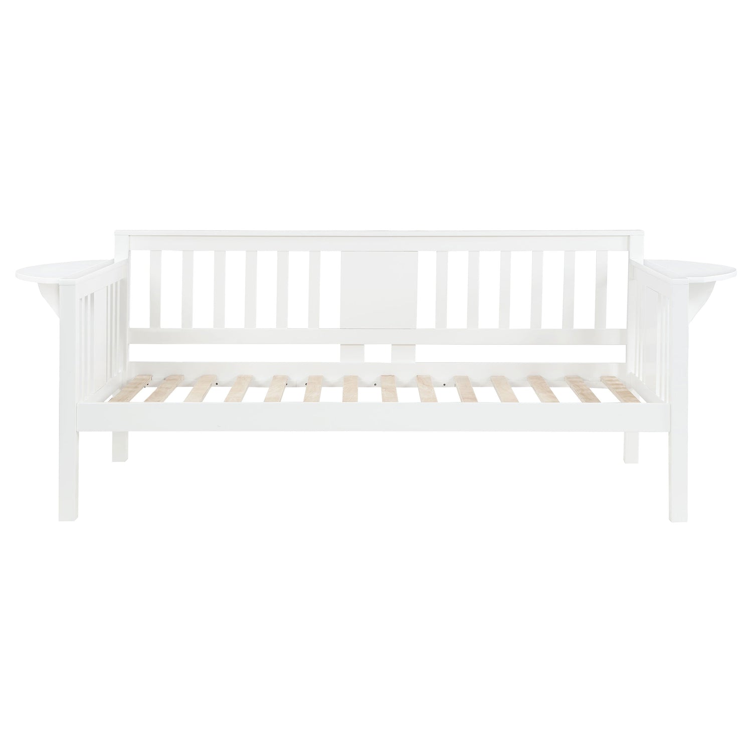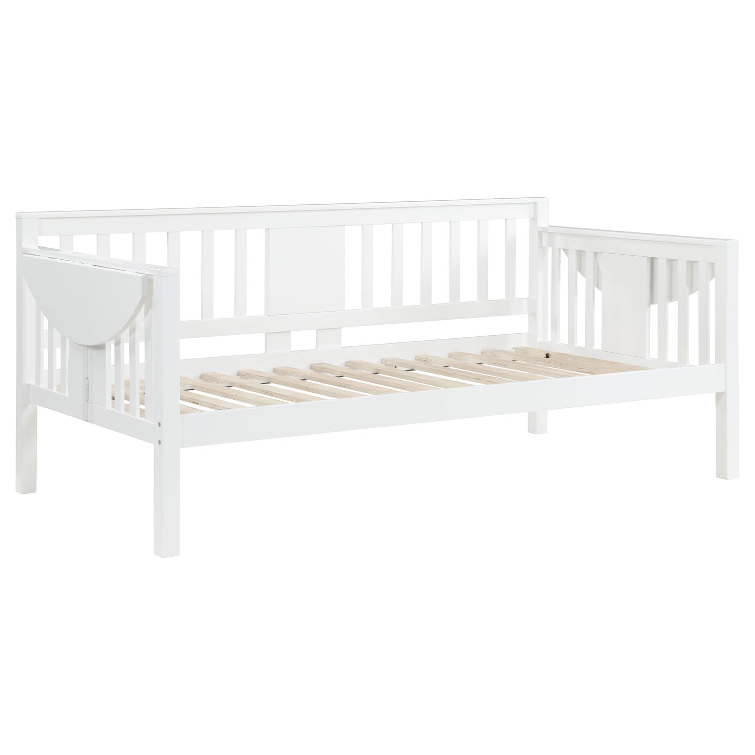 Create a spot to relax in your home office or freshen up a teen's bedroom with a contemporary wood daybed. Perfect for a casual look and feel, it features a neutral finish over pine and plywood construction, offering classic energy in an updated package. The bed features a vertical slat framework, complete with solid panel accents on three sides. Each side of the daybed includes a drop-down panel, creating a compact tabletop surface perfect for stashing essentials like your phone or a great book. A daybed offers impressive versatility, with a stylish look that works for lounging or sleep.