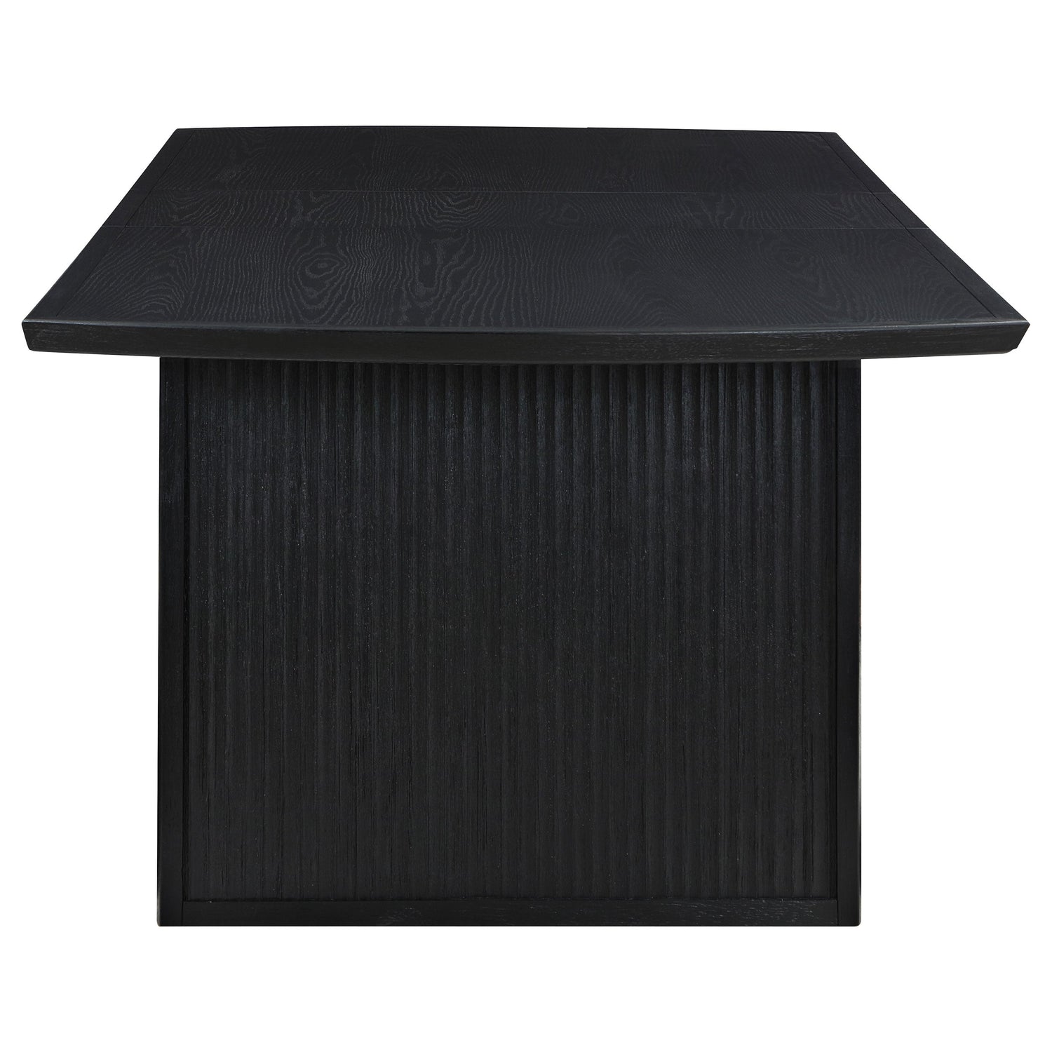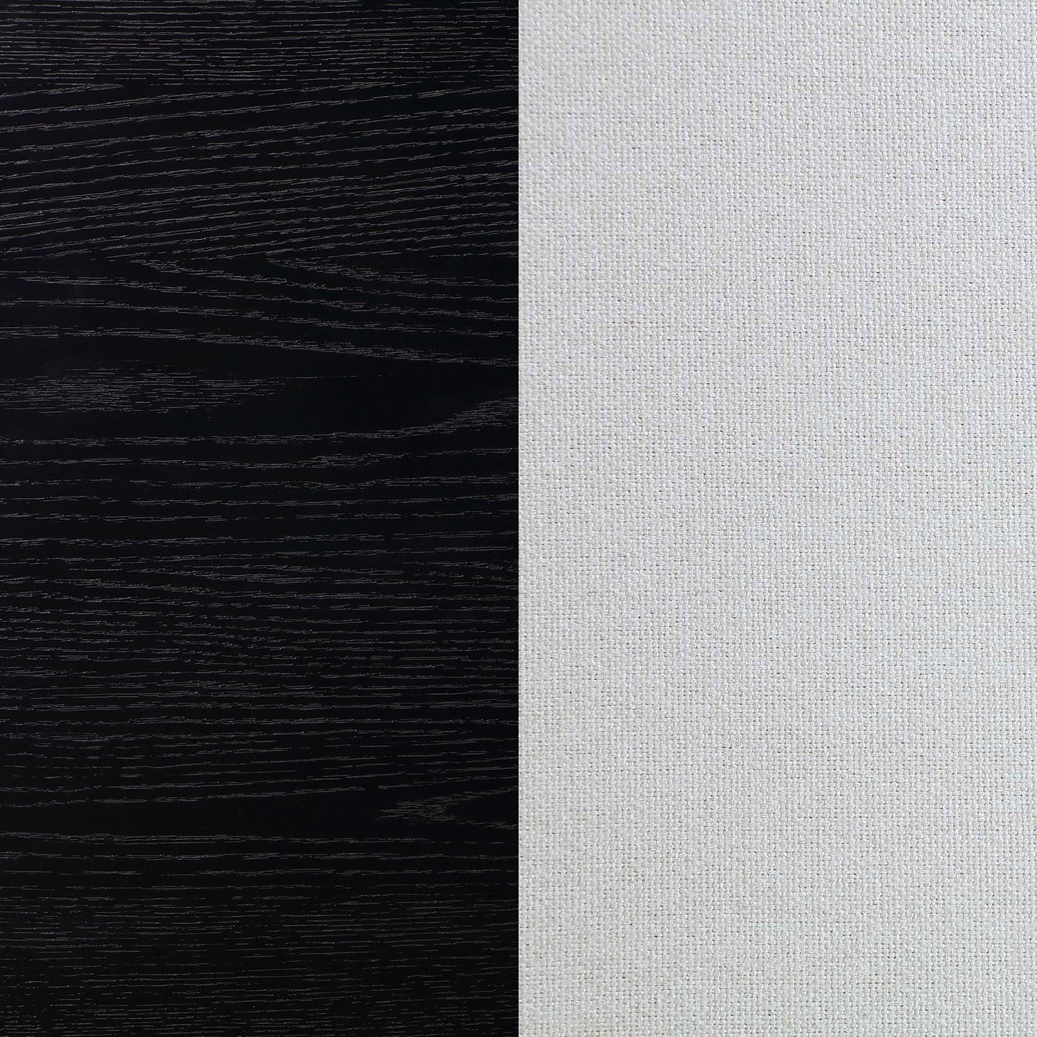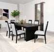 A notable color contrast and ultra-dramatic look make an impact in your modern or transitional dining space, creating a focal point worthy of consideration. This seven-piece wood and fabric dining set is adaptable to embellish a host of settings important to your everyday living. Distressed black finish wood construction on all pieces gains attention to a minimalist table design with straight, flat leg sections under a sleek top with linear silhouetting and a dimensional top chamfer curving along its edges. Chairs offer a clean silhouette with black finish wood framing, tapered legs, and ornate notched tops with linear carvings thrown in for extra dimension. Soft ivory fabric upholstery is intriguingly placed on both sides of top cushions and over a padded seat.