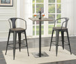 Bring a stylish, industrial vibe to your dining nook or home bar with this chic three-piece bar set. The set features a square bar table with an embossed solid bamboo top in a rich dark elm finish, complemented by a sleek black powder-coated metal base. Paired with two sturdy bar chairs, each with a black frame and matching dark elm-finished bamboo seat, this set provides both comfort and modern flair. The chairs offer ergonomic support with curved backrests and armrests, perfect for enjoying drinks or casual meals. With its durable construction and minimalist design, this bar set is ideal for intimate gatherings and compact spaces, effortlessly blending rustic charm with contemporary elegance.