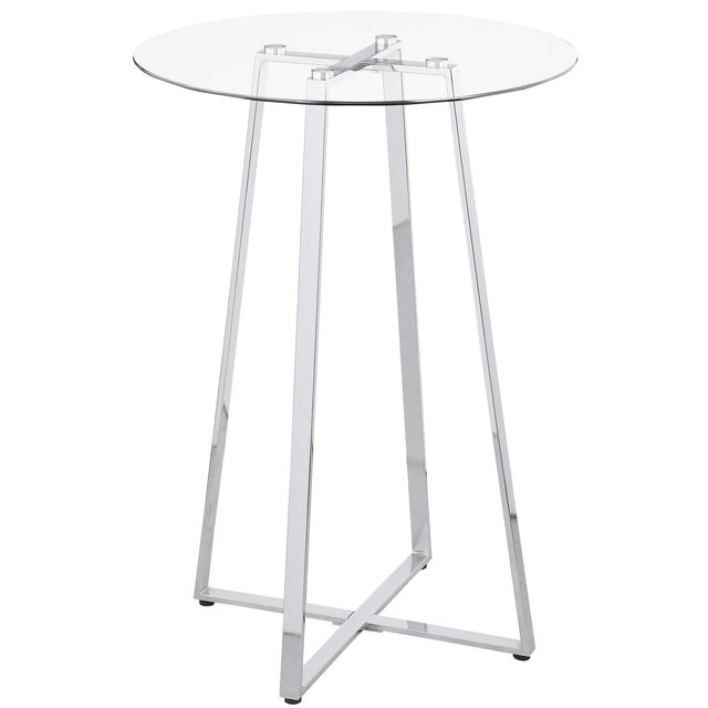 Whether you're sitting down to an intimate dinner or enjoying a cocktail with friends, this contemporary bar table helps you entertain in style. Its compact size allows for a variety of placement options, making it ideal for a small kitchen or dining area. An attractive yet simple design blends seamlessly with any home decor. Smooth, clean, tapered lines and a gleaming chrome finish give it a pleasingly modern appearance. A round, clear, tempered glass top completes its elegant look