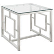 This square end table combines contemporary style with a sleek design, making it an excellent addition to any living room. The clear tempered glass top is durable and easy to maintain, while the electroplated chrome frame provides a polished, reflective finish. Its open geometric base enhances the modern aesthetic and offers structural stability. Ideal as a side table for functional use or decorative display, this versatile piece blends form and functionality with high-quality materials.