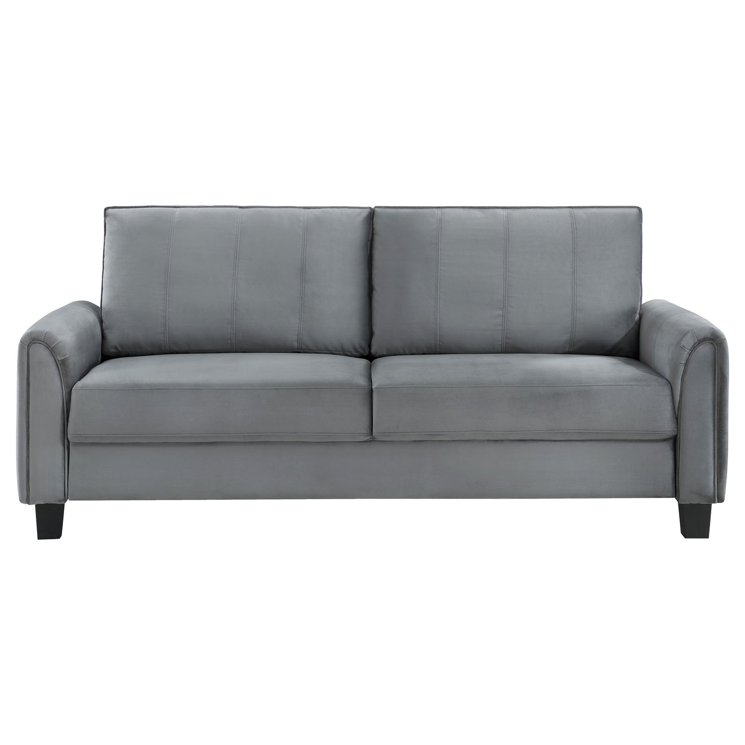 Create a welcoming, refined living space with a modern two-piece sofa set. Each is upholstered in velvety soft gray fabric, with stitching accents that add depth and detail. Plush cushions include reversible back pillows, with sinuous spring decking under seats to ensure support and comfort. Rounded arms define its structured silhouette, complete with piping trim and subtle pleating that adds dimension. Add colorful accent pillows to bring a personalized touch.