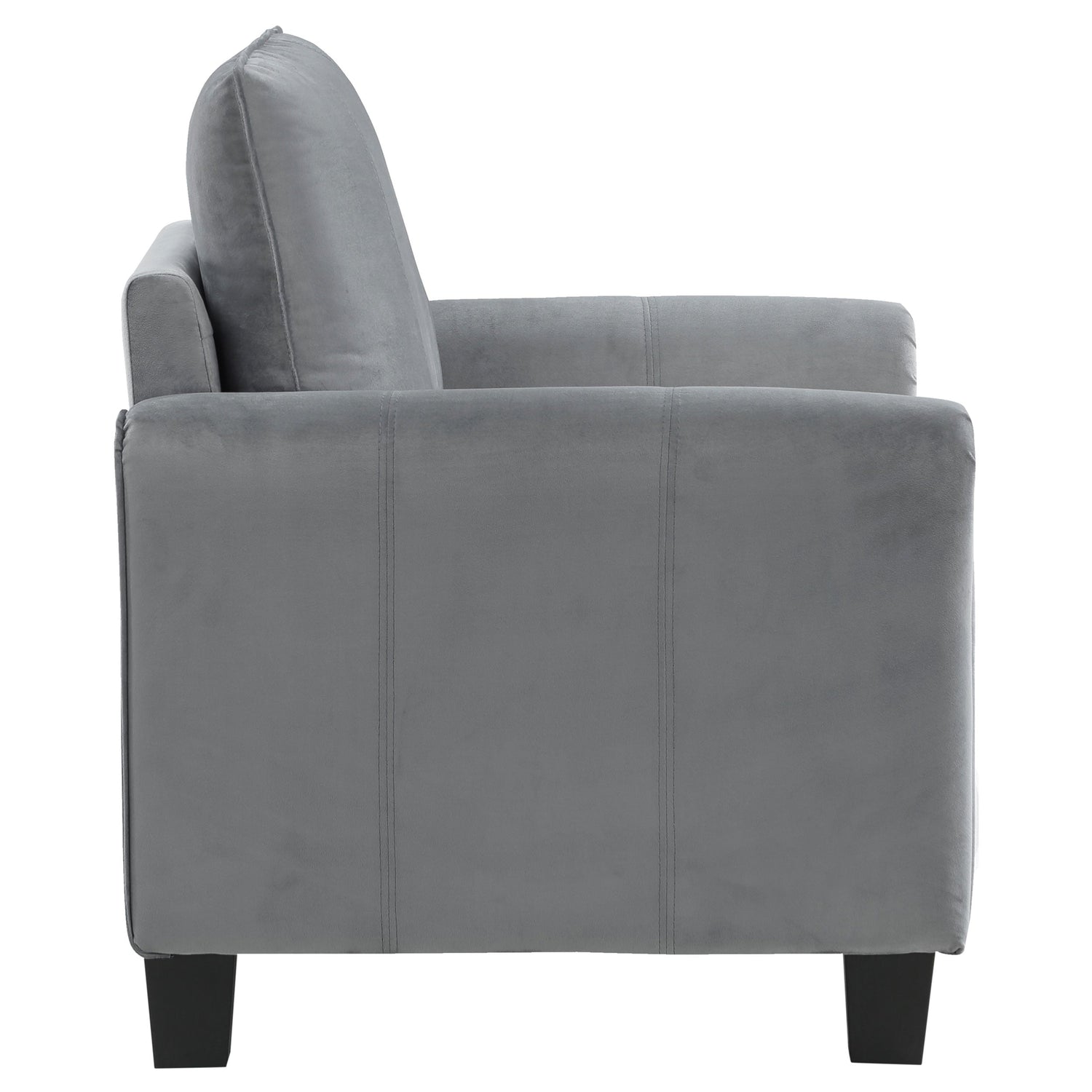 A perfect blend of comfort and sophistication, this three-piece modern sofa set is a chic centerpiece for your living room. It boasts a sofa, loveseat and armchair, each with velvety soft gray upholstery that creates a sleek but inviting ambiance. Back cushions feature vertical accent stitching and are reversible for added versatility. Rounded arms and block feet deliver a structured silhouette, creating a sense of gravitas in any sitting aera. Cushions are supported with sinuous spring decking and webbed backing, ensuring optimal support for everything from lounging to entertaining.
