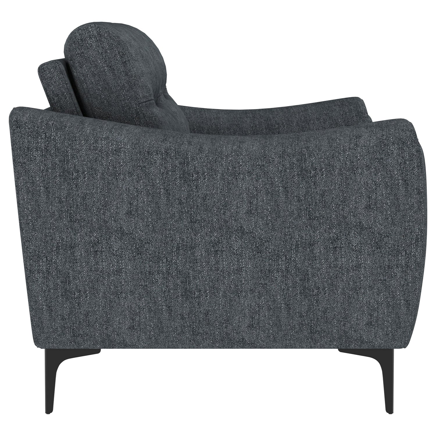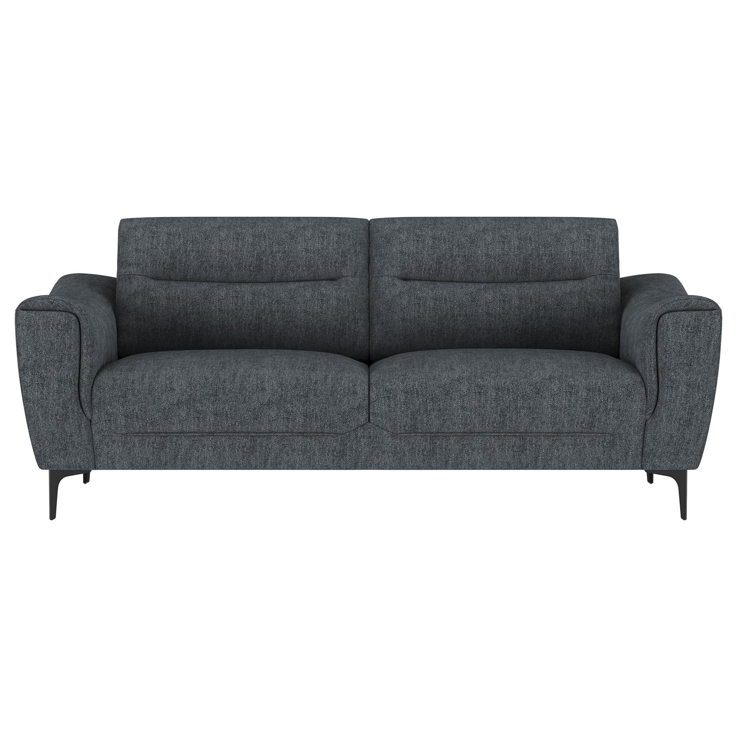 Indulge in effortless style and comfort with this chic transitional sofa set. Soft charcoal upholstery gracefully harmonizes with any décor, while plush pocket coil seat cushions and modern track arms provide inviting support for your downtime. Designed with attached cushions for a neat appearance and innovative metal legs that allow for easy assembly, this collection elevates the overall ambiance of your living space.