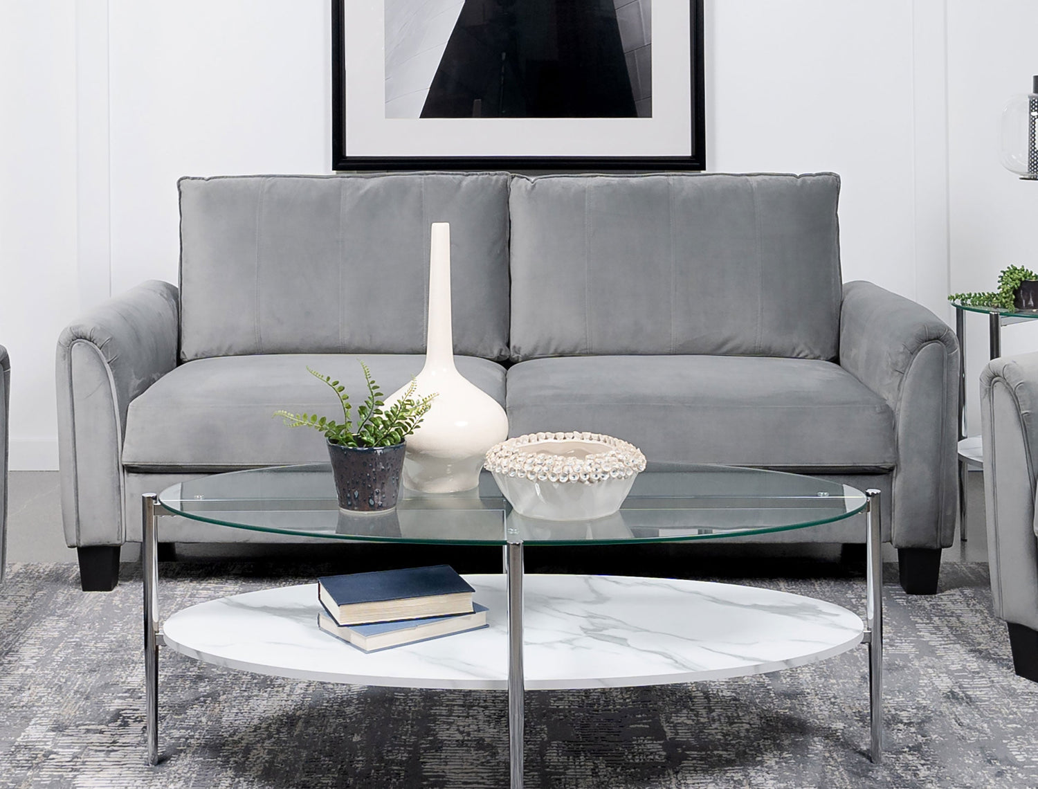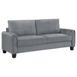 Captivating character blends with timeless style in a modern upholstered sofa. In gray upholstery that's soft like velvet, the sofa is a lovely focal point for a living room seating group, offering refined, understated style and plenty of comfort. Rounded armrests feature gentle pleating for a smooth, sleek look and feel. Stitching accents and block feet complete the look, offers depth and structure. Back cushions are reversible, great for busy homes.