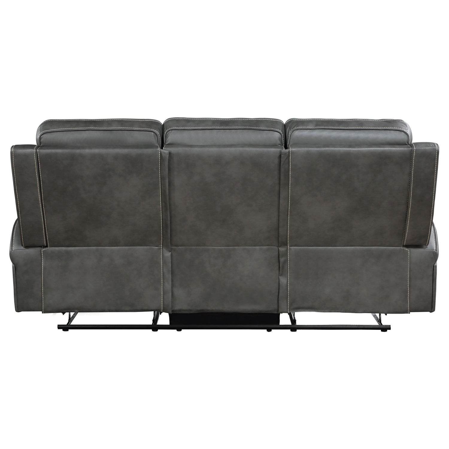 Merging the classic style of both contemporary and transitional design schemes, the motion sofa creates a dreamy venue for relaxing and entertaining. Choose a pleasing motion sofa covered in smooth grey leatherette upholstery with vertical topstitching adding decorative elements and a dimensional impact. This sofa features foam padding on its frame and in-pocket coil spring seat cushions, as attached back cushions are capped with ultra-plump headrests. Recline into varying positions using a manual control function, and enjoy space efficiency with its wall-hugger design. A timeless style and luxurious comfort converge to offer a multi-functional and beautiful piece for entertaining or solo relaxation.