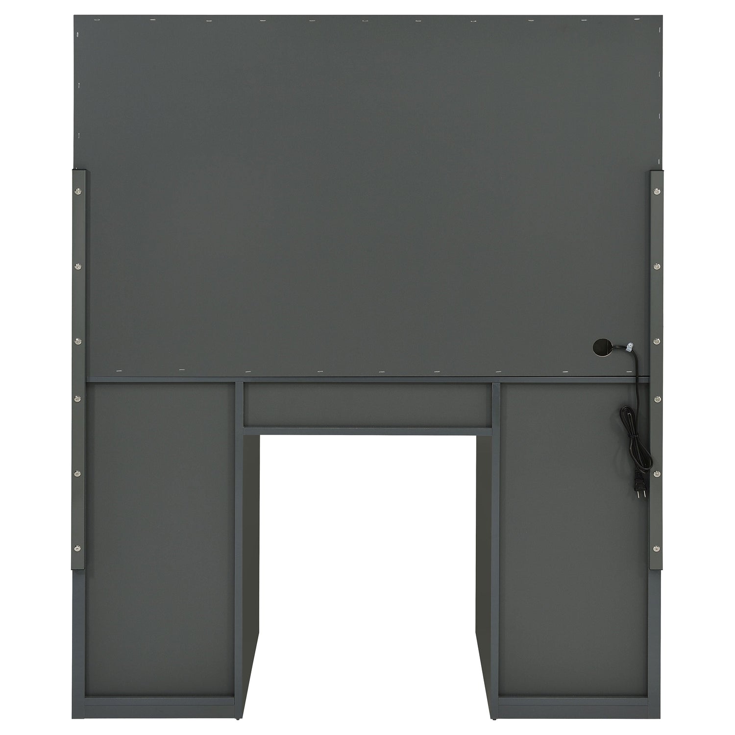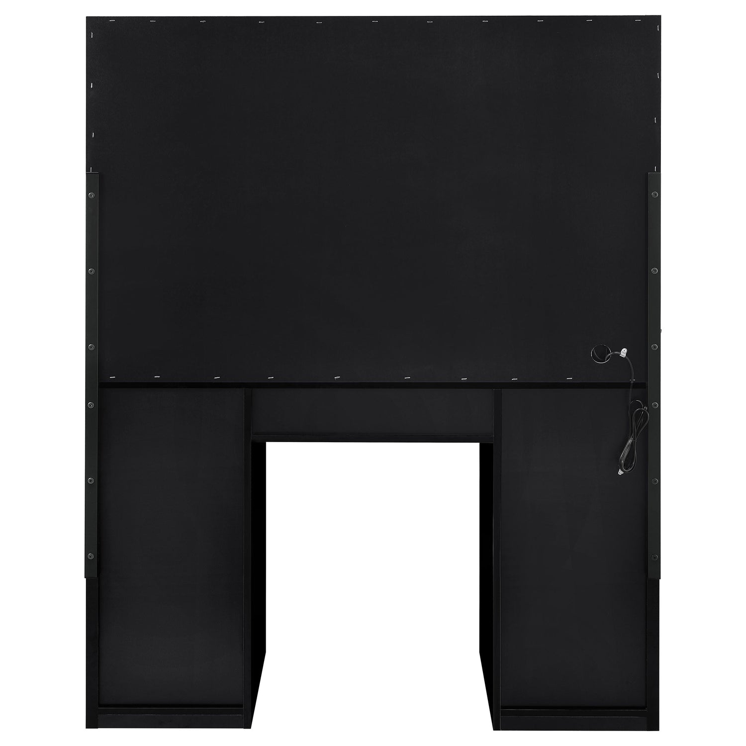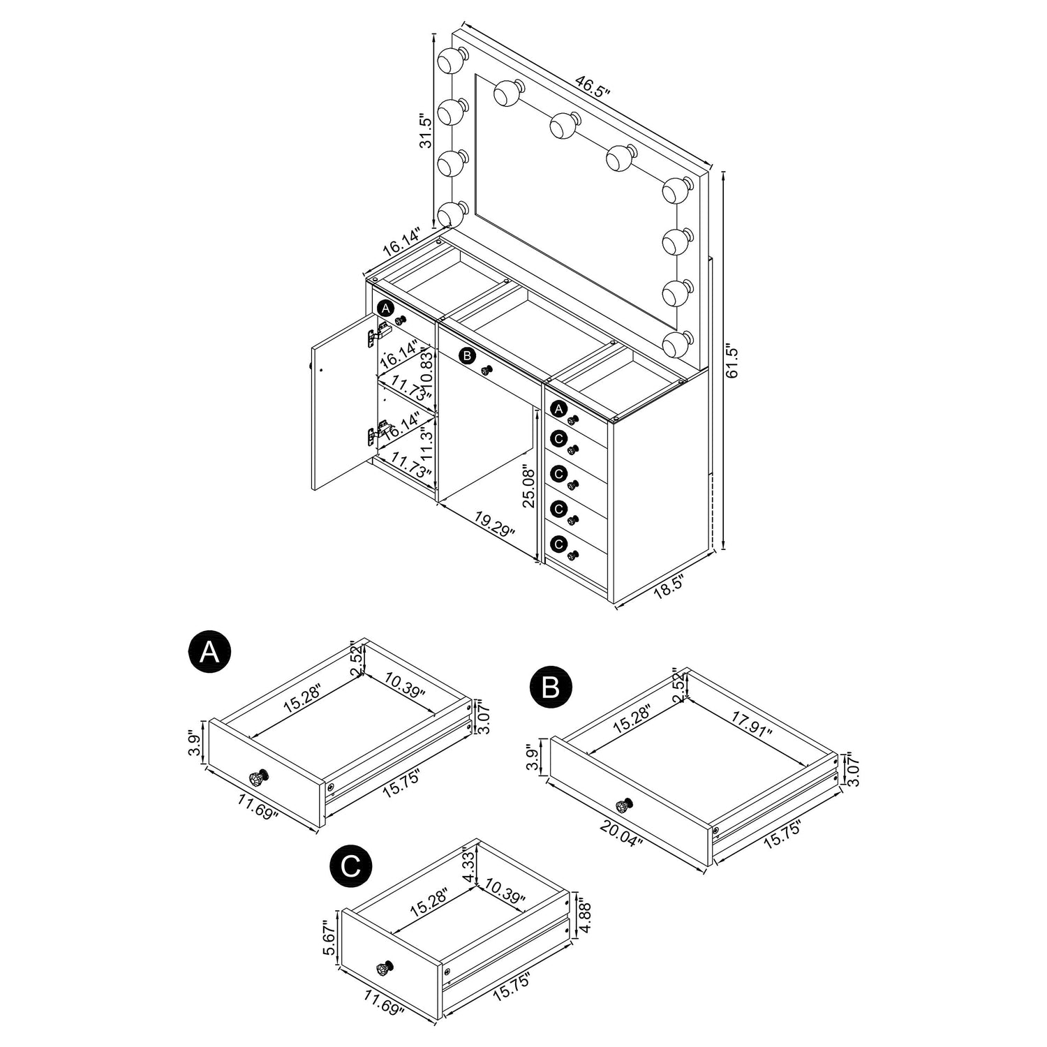 Create space for all your makeup, skincare and hair needs with this contemporary lighted vanity table and mirror. A sleek, fresh look, it boasts a glass top that allows you to see items placed in top drawers. Seven drawers total create easy opportunity for organization of all your products. A cabinet adds adjustable shelving for larger items. The mirror is lighted on three sides, offering multi-directional illumination for even lighting as you apply makeup or fix your hair.