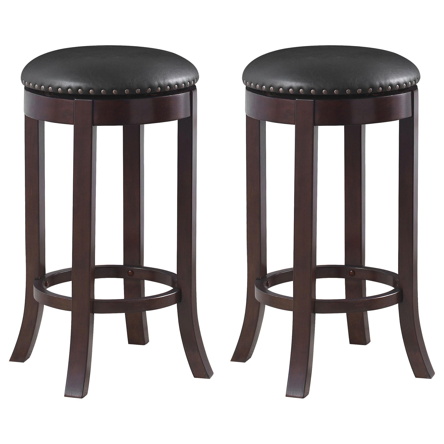 Transform your recreation room or wet bar into an appealing area for entertainment. Reminiscent of an old-fashioned pub, this barstool is tasteful and stylish. Smooth, dark brown upholstery pleasingly complements its leg finish of medium brown. Eye-catching metal rivets lend a pleasing touch of panache. With a comfortable foot rest and round swivel seat, this stool is an excellent option for adding comfort and glamour to your home.