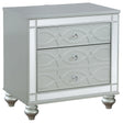 Bring modern glam to a classic design with this transitional two-drawer nightstand. It features a glitzy design that draws the eye in any modern home. It's crafted with a vibrant silver metallic finish with fret work detail on the front panels and drawer fronts. The drawers are adorned with crystal-like pulls and the top one is lined with black felt. Dual USB ports and delicate bun feet complete the design of this exquisite accent piece.