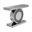Add dazzling flair to your entryway or living room with this glamorous console table. Featuring a mirrored surface and a bold geometric design, it showcases a sculptural circular base encrusted with glittering silver crystals. The sleek rectangular top and base are wrapped in glass for a luxe finish that reflects light and elevates any contemporary or Hollywood glam space.